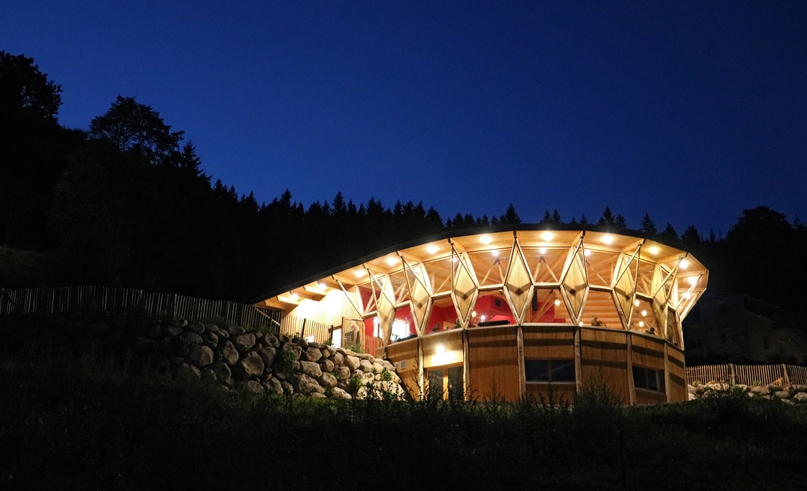 - Matériaux : structure bois ronds, bardage pin douglas, bacs aciers, plaquettes forestières, ouate de cellulose, parquet chêne, menuiseries pin sylvestre, établi pin douglas