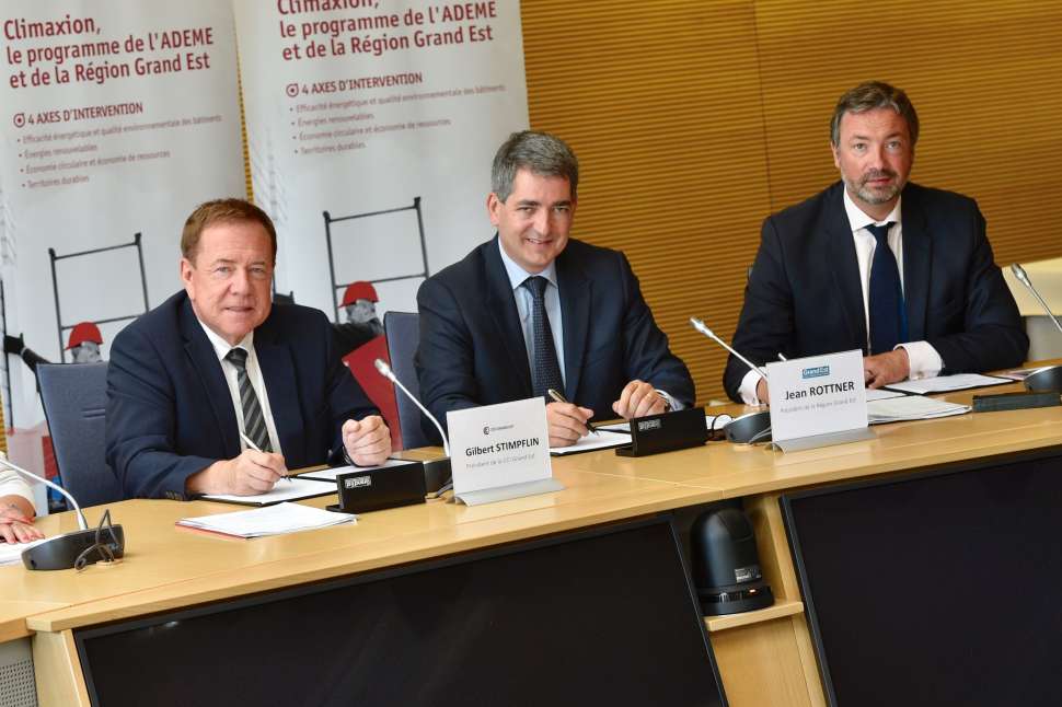 Dans le cadre du programme Climaxion, la Région Grand Est et l’ADEME mettent en œuvre un ensemble d’actions sur l’économie circulaire, essentiellement tournées vers l’offre aux acteurs économiques : achats durables, écoconception, économie de la fonctionnalité, économie et gestion des ressources, écologie industrielle et territoriale et efficacité énergétique. Afin d’intensifier l’engagement des entreprises dans ces domaines, un accord cadre a été signé ce mardi 19 juin 2018 par Messieurs Jean ROTTNER (centre de la photo), Président de la Région Grand Est, Arnaud LEROY (droite de la photo), Président de l’ADEME et Gilbert STIMPFLIN (gauche de la photo), Président de la CCI Grand Est.