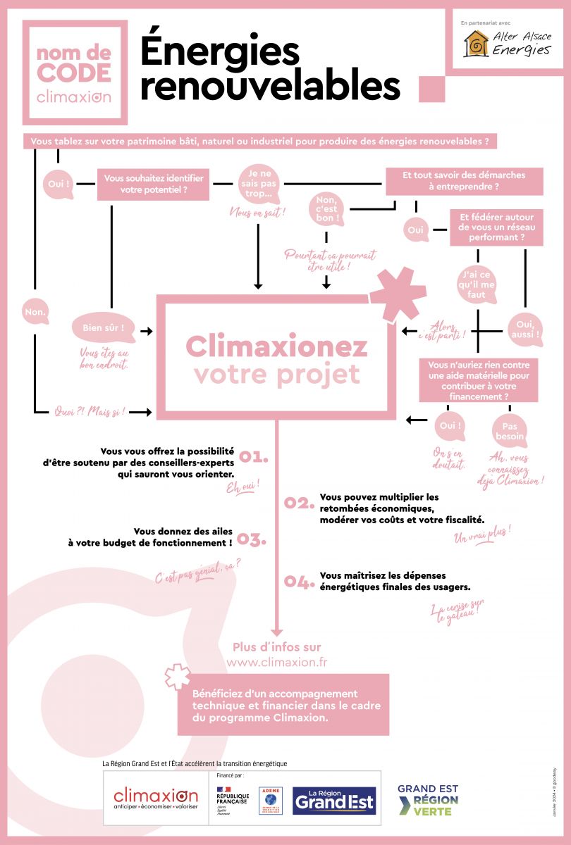 La Région Grand Est et l'ADEME, à travers le programme Climaxion, soutiennent le développement des énergies renouvelables. Les acteurs du Grand Est, collectivités ou entreprises, peuvent bénéficier d'un accompagnement sur-mesure et d'aides spécifiques pour s'engager dans l'installation d'énergies renouvelables, et produire une énergie verte.