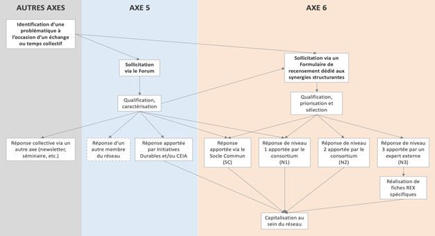 Apport d’expertise à la mise en œuvre de synergies : l’équipe-projet se chargera de compiler et qualifier les sollicitations concernant l’appui de synergies en développement. Un formulaire dédié à ces sollicitations sera créé afin de recenser les besoins des animateurs sur des synergies structurantes. Ces demandes feront l’objet, en fonction de leur complexité et de leur pertinence, d’un des 4 niveaux de traitement suivant :