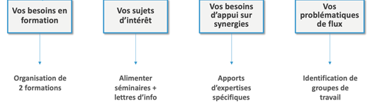 - Formations : une formation par an sera organisée afin d’aider votre monter en compétence sur des sujets facilitant le développement des synergies et de vos démarches. Nous vous interrogerons sur vos besoins en formation lors des entretiens individuels et des questionnaires en ligne.