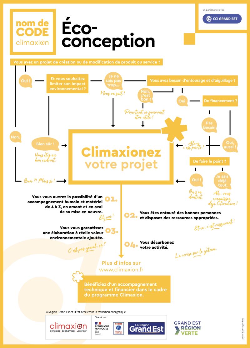 La Région Grand Est et l'ADEME, à travers le programme Climaxion, soutiennent les démarches d'écoconception. Les entreprises souhaitant s'inscrire dans une démarche d'écoconception peuvent bénéficier d'un accompagnement expert et d'aides spécifiques pour réaliser les études préalables et développer leur projet.