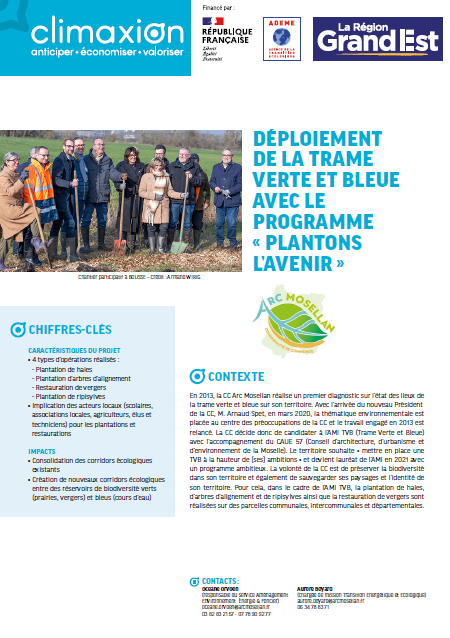 En 2013, la CC Arc Mosellan réalise un premier diagnostic sur l’état des lieux de la trame verte et bleue sur son territoire. Avec l’arrivée du nouveau Président de la CC, M. Arnaud Spet, en mars 2020, la thématique environnementale est placée au centre des préoccupations de la CC et le travail engagé en 2013 est relancé.