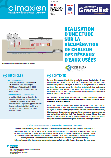 orsque Saint-Louis Agglomération a souhaité amorcer la réalisation de son Plan Climat Air Energie Territorial (PCAET), des discussions internes entre services ont permis d’envisager la piste de la récupération de la chaleur contenue dans les eaux usées. Ces réflexions s’intégraient dans la démarche de labellisation climat-air-énergie de la collectivité, dont le cahier des charges demandait d’explorer tous les gisements potentiels d’énergies renouvelables et de récupération du territoire.