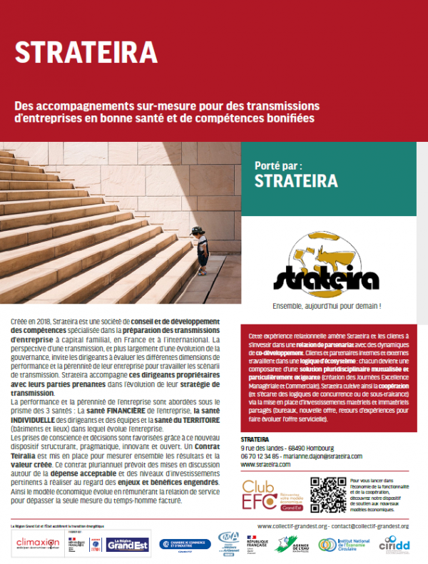 Créée en 2018, Strateira est une société de conseil et de développement des compétences spécialisée dans la préparation des transmissions d’entreprise à capital familial, en France et à l’international. La perspective d’une transmission, et plus largement d’une évolution de la gouvernance, invite les dirigeants à évaluer les différentes dimensions de performance et la pérennité de leur entreprise pour travailler les scénarii de transmission. Strateira accompagne ces dirigeants propriétaires avec leurs parties prenantes dans l’évolution de leur stratégie de transmission.