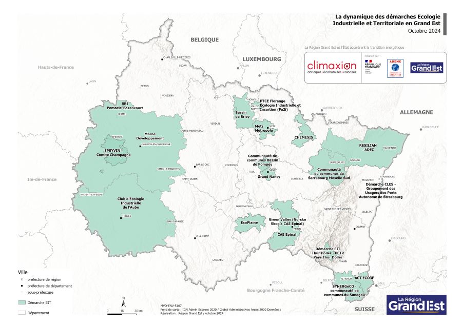 Ainsi, le programme Climaxion a soutenu pendant près de 10 ans le développement de démarches EIT, aujourd’hui nombreuses, et permettant à la région Grand Est d’être l’une des plus dynamiques de France en la matière. Le nombre de démarches en cours offre une visibilité plus importante aux principes de l’EIT et permet des retours d’expériences nombreux entre territoires (à travers notamment le Réseau EIT Grand Est, présenté ci-dessous). Par ailleurs, les démarches EIT s’inscrivent souvent dans les orientations stratégiques du territoire à travers notamment des Pacte Offensif Croissance Emploi (POCE) ou encore des Territoires d’Industries (TI). Cette inscription illustre bien la pertinence des principes de l’EIT au regard des enjeux de développement économique et la volonté des territoires de porter ces principes.