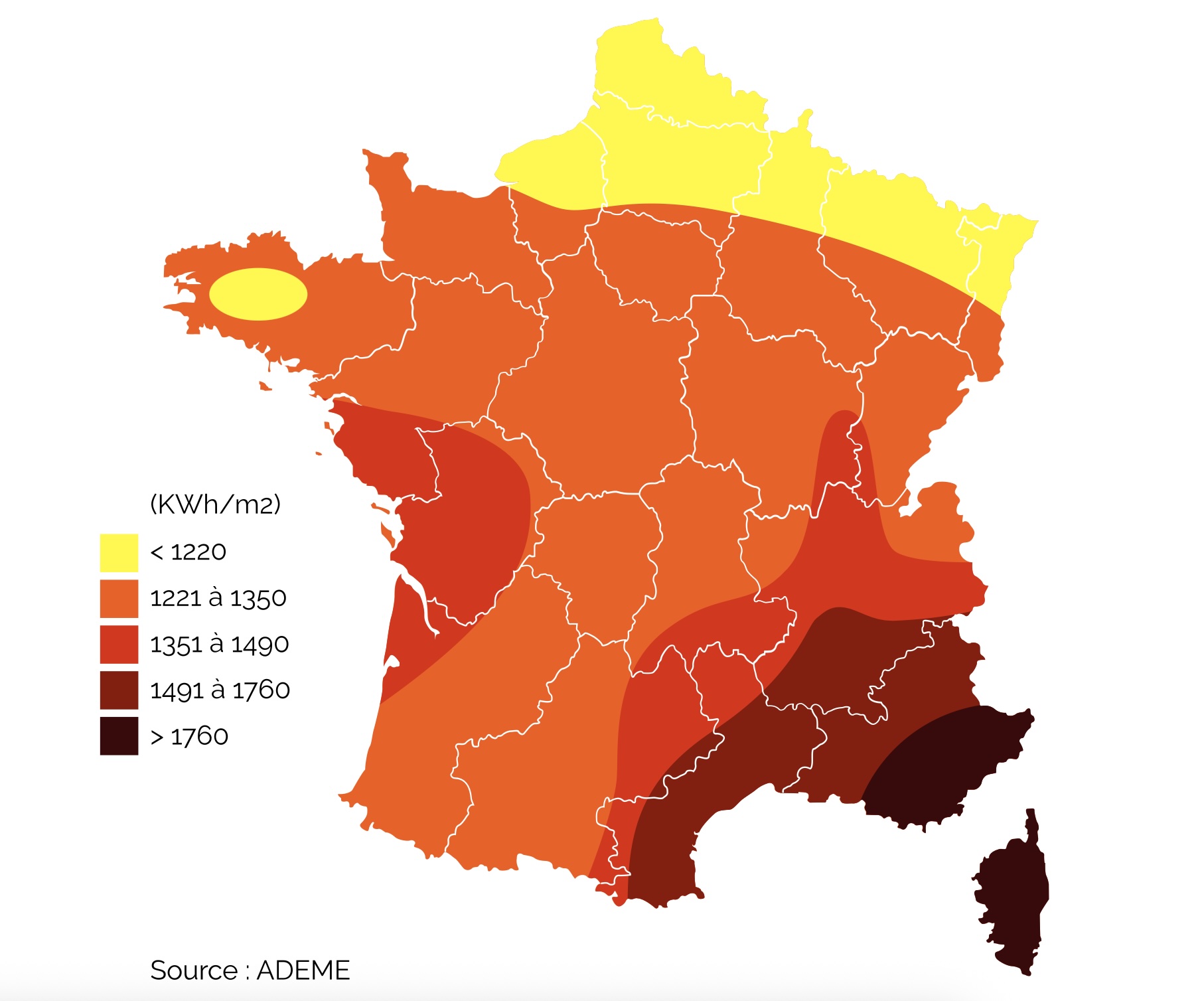 Sur le territoire français, chaque mètre carré reçoit en moyenne chaque année environ 1 000 kWh d’énergie solaire, l’équivalent de 100 litres de pétrole.