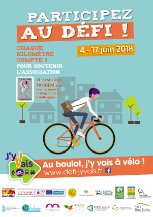 > Le Défi « Au boulot, j’y vais à vélo », organisé par 13 territoires en démarche « Climat Air Energie » répartis sur les départements du Bas-Rhin, du Haut-Rhin et des Vosges, se déroule du 4 au 17 juin 2018. Il est aussi combiné à un défi vélo écoles et à un défi multimodal pour certains territoires. Climaxion est partenaire de ce défi.