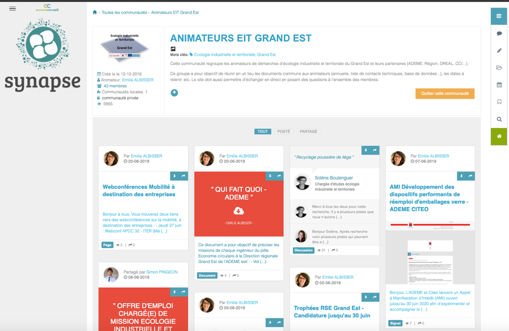- L’animation d’une communauté en ligne sur la plateforme Économie circulaire. Cette communauté reprend l’ensemble des documents et outils créés pour les animateurs locaux dans le cadre du réseau (annuaires, lettres d’information, liste des synergies développées en Grand Est, trames adaptables, etc.). N’hésitez pas à solliciter de l’aide sur l’espace « Forum » afin de répondre à des difficultés que vous rencontreriez.