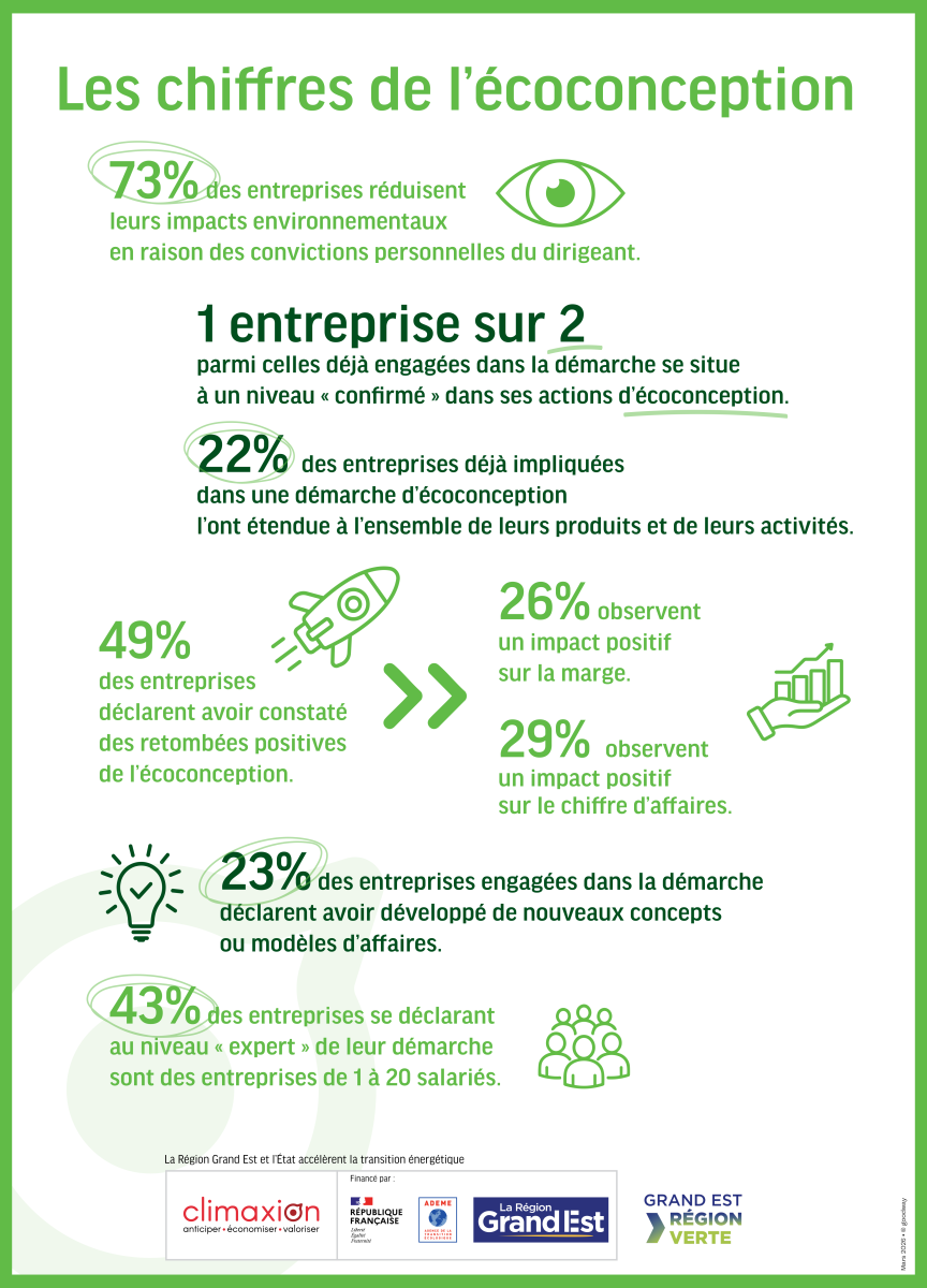 De la sensibilisation à la mise en œuvre concrète, la Région Grand Est et l’ADEME, à travers le programme Climaxion, accompagnent les entreprises du territoire dans toutes les étapes de leurs démarches d’éco-conception : appuis méthodologiques, diagnostics, accompagnements techniques, soutiens financiers et mise en réseau... De multiples dispositifs permettent à chaque organisation d’avancer à son rythme, de manière structurée et sécurisée, pour transformer ses projets en solutions plus durables, plus utiles et plus performantes.